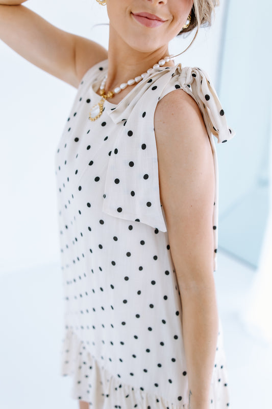 POLKA DOT SHOULDER RUFFLE MINI DRESS