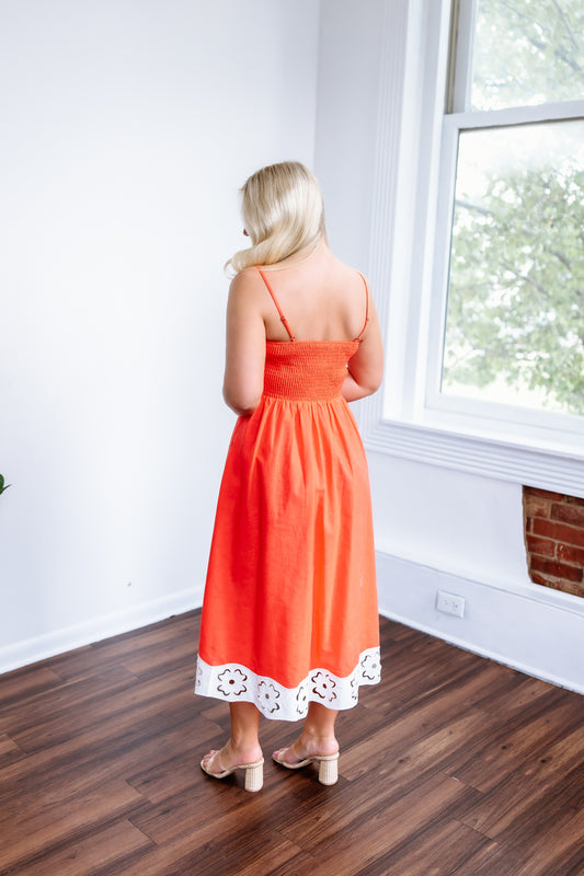 TO GREECE EMBROIDERED FLORAL MIDI DRESS