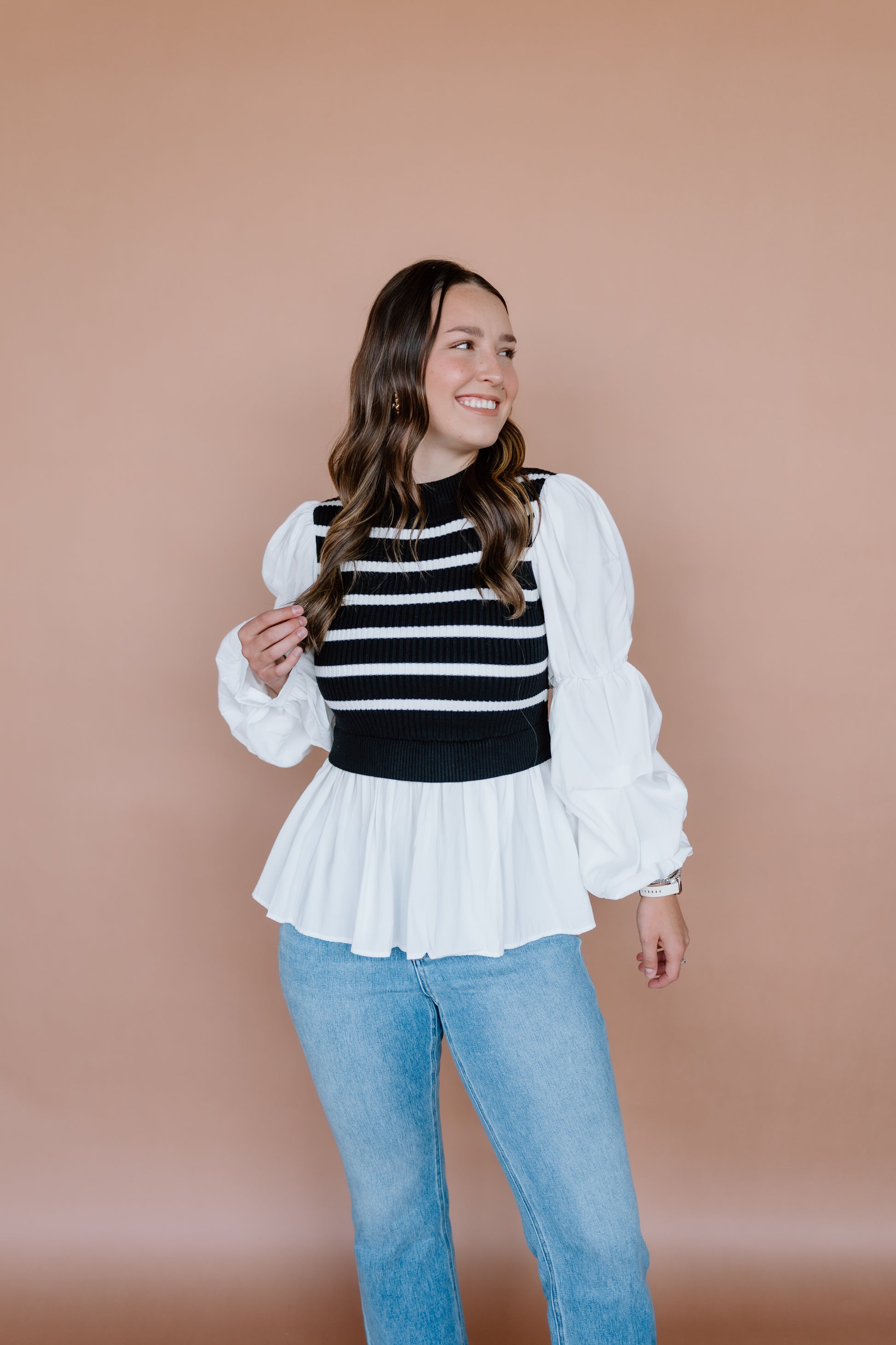 This charming top combines a cozy knit bodice with playful puffy long sleeves for a delightful mixed media look. The mock neck adds a touch of elegance, while the peplum hem creates a flattering silhouette. Perfect for brightening your day with style and comfort!