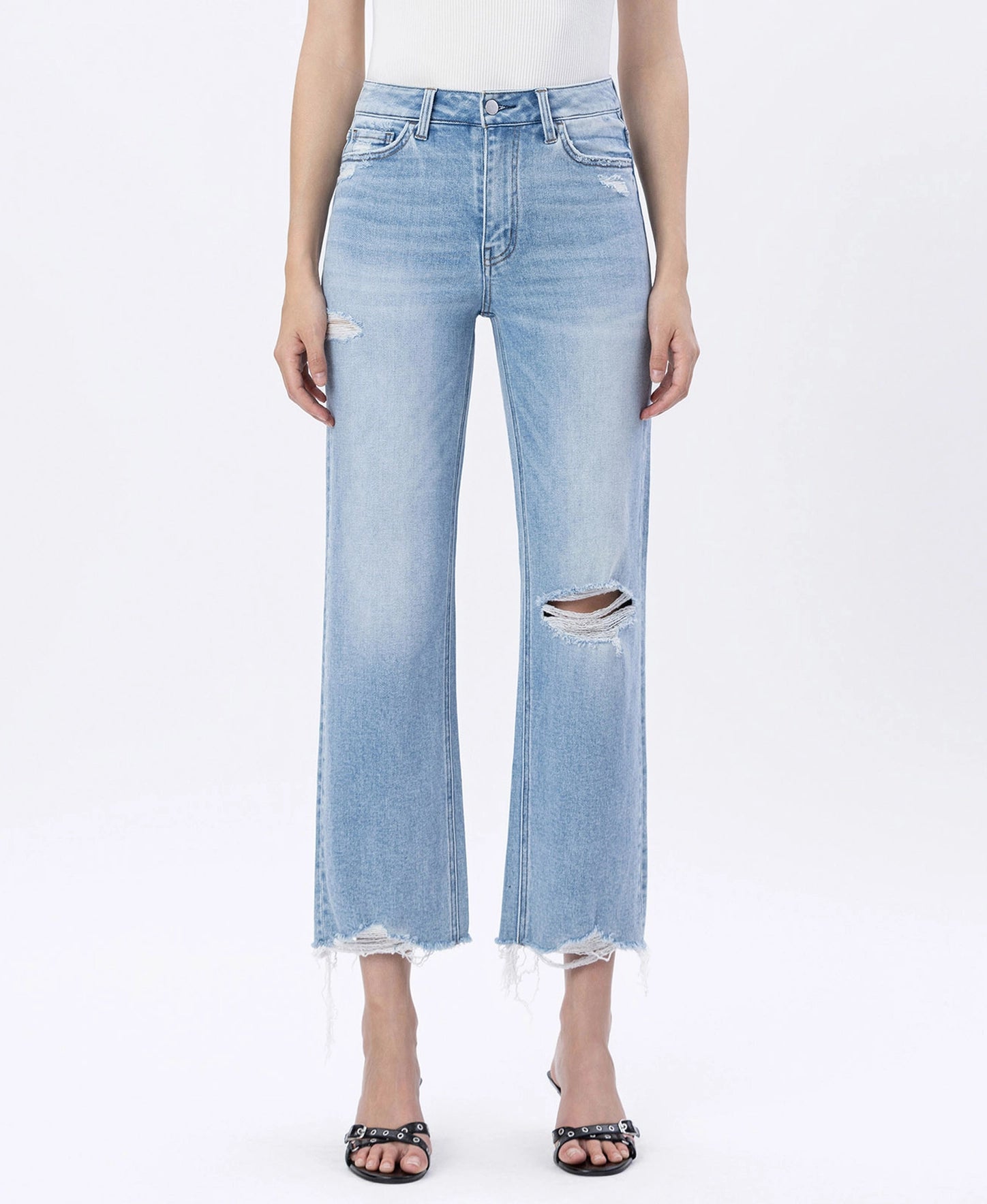 These EZRA High Rise Slim Wide Leg Jeans combine comfort and style with their stretch denim fabric and flattering high-rise waist. Featuring trendy distressed details and a raw hem, they offer a modern cropped length that pairs perfectly with your favorite tops. With a 10½" rise, 27" inseam, and an 18" leg opening, these jeans provide a relaxed yet tailored fit that’s both chic and comfortable. Perfect for adding a fresh, happy vibe to your wardrobe!