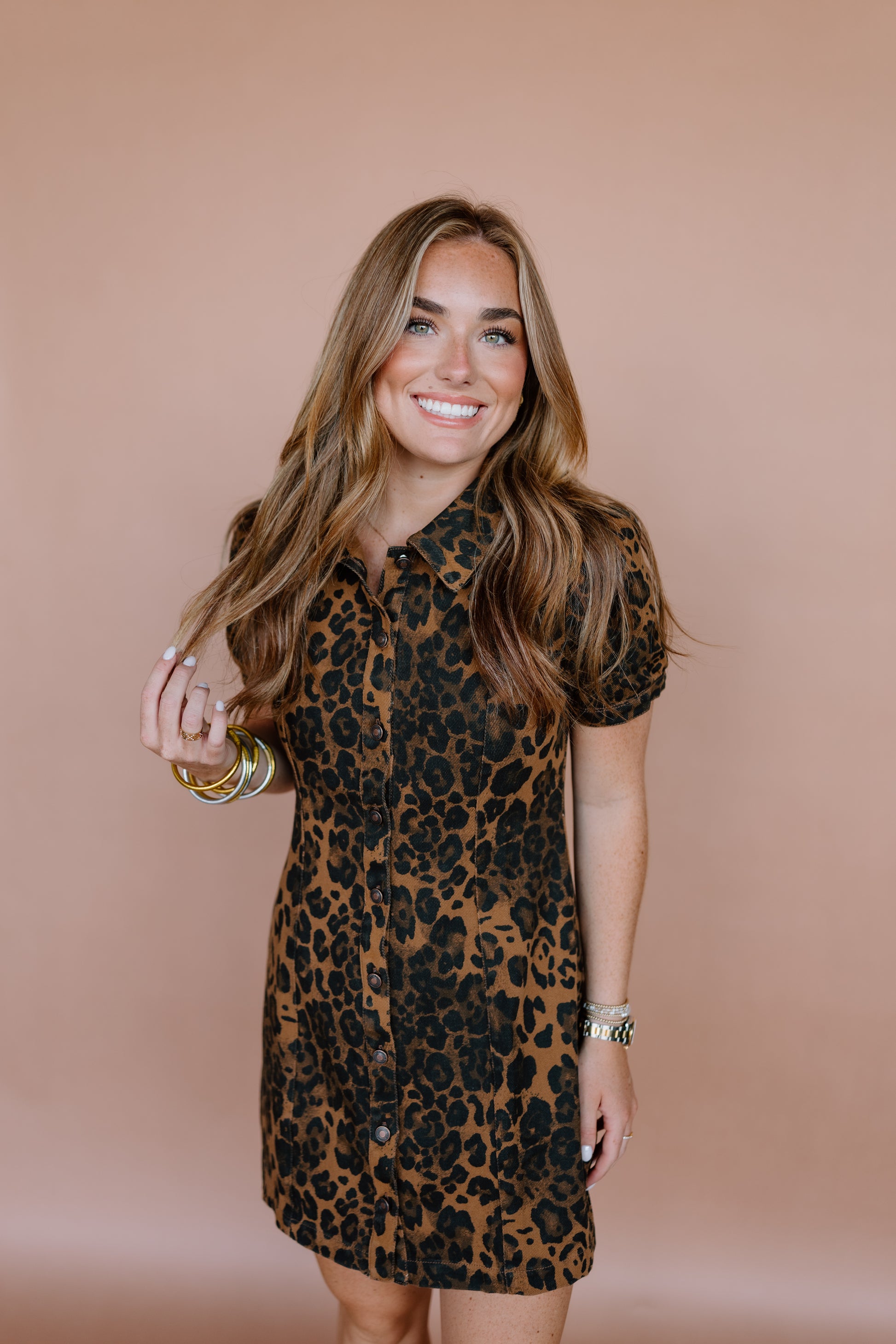 Elevate your wardrobe with this chic leopard print denim shirt dress, featuring playful short puff sleeves that add a touch of bold sophistication. Designed to run true to size, it offers a flattering fit that balances style and comfort effortlessly. Perfect for making a confident statement, this dress combines classic denim durability with a trendy animal print for versatile wear. The model is shown wearing a size small for reference.