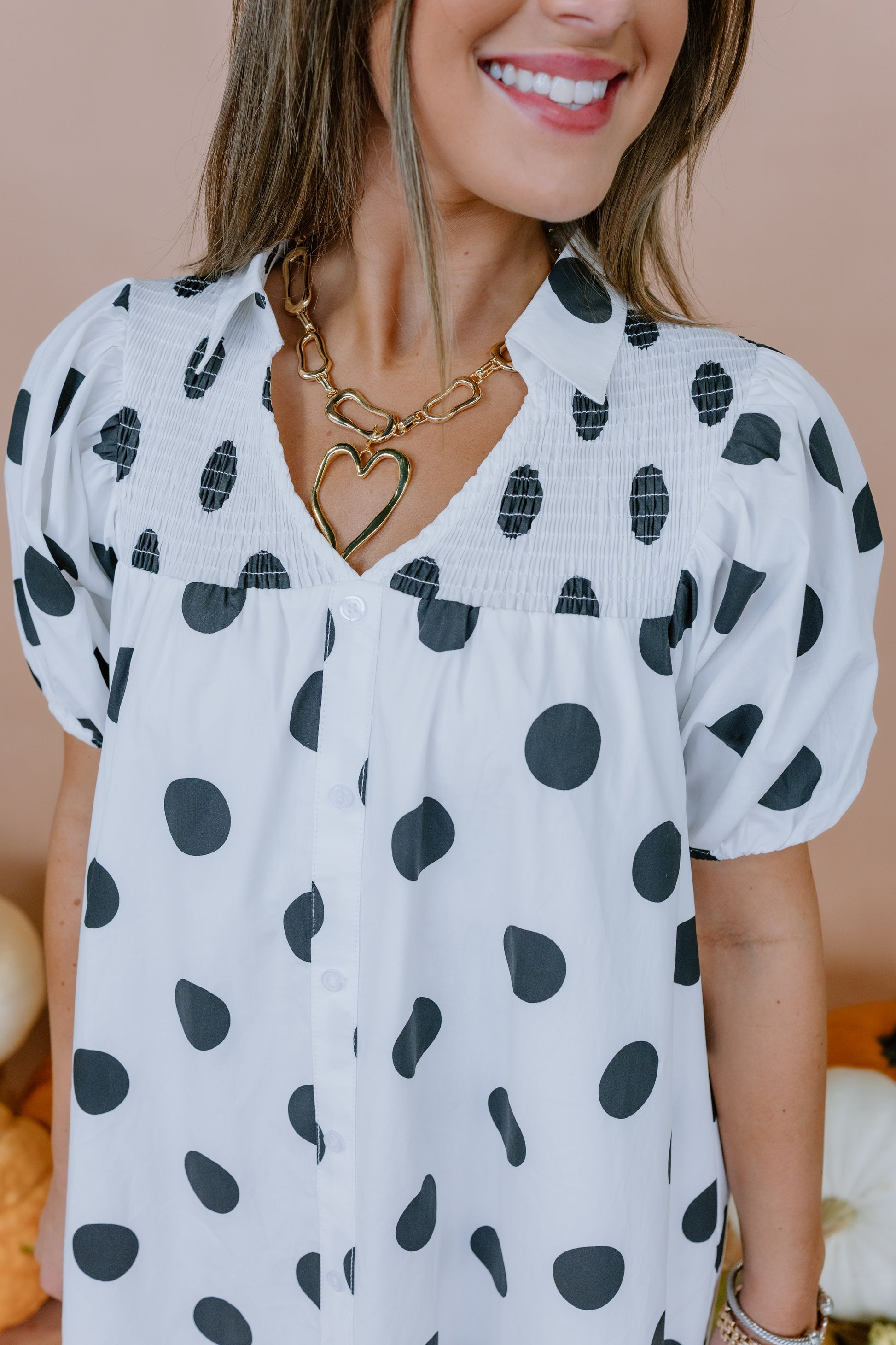 This Polka Dot Button Down Midi Dress offers a relaxed fit with an intentionally oversized silhouette for effortless style. Designed to flow gracefully, it features classic button-down details and playful polka dots. The model is 5ft tall and wears a size small, which provides a reference to its roomy sizing and flattering midi length. Ideal for both casual and refined occasions, this dress combines comfort with timeless charm.