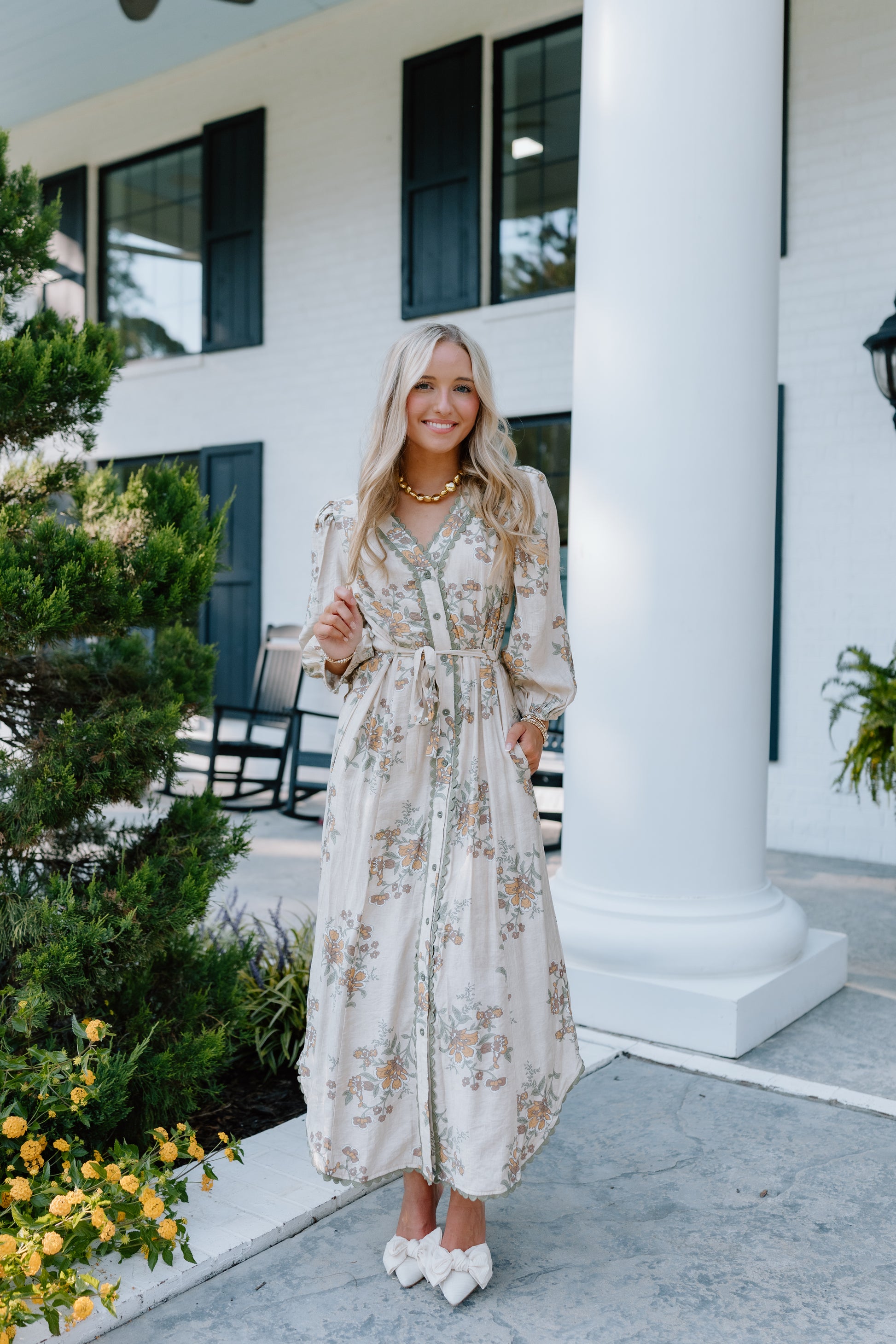 Embrace effortless charm in the Long Way Floral Midi Dress. This lightweight, woven dress features a flattering V-neck and delicate scalloped embroidered trim for a touch of elegance. With 3/4 sleeves, a button-front closure, and a self-tie back waist, it offers a comfortable, adjustable fit. Enjoy the practicality of side pockets and a fully lined, non-sheer design perfect for all-day wear.